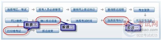 阶段一:从[选择考区、考试]到[选择考试科目],这个阶段为填写考生报名的基础信息和选择考试科目。提交报名资料后系统会保存你的报名信息,如不确定是否能进行网上缴费,可暂时不进行后面的报名步骤,待确定开通银联的网上银行后你可通过[网上缴费]完成剩余的步骤,无需再重新报名。 #