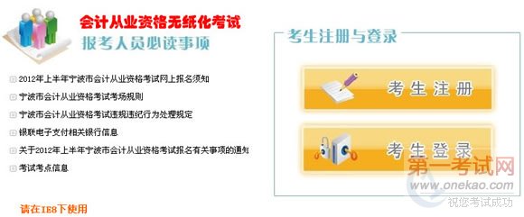 宁波2012年上半年会计从业资格考试时间安排 2012年上半年考试时间从5月19日开始举行,结束时间根据报考情况确定。报考人员实际参加考试时间以考生报名成功后自行选择考点及考试时间后产生的考试通知单时间为准。 网上报名时间为2012年2月10日上午10:00至2月21日下午5:00。 现场资格审核时间为2012年2月10日至2月20日工作时间。