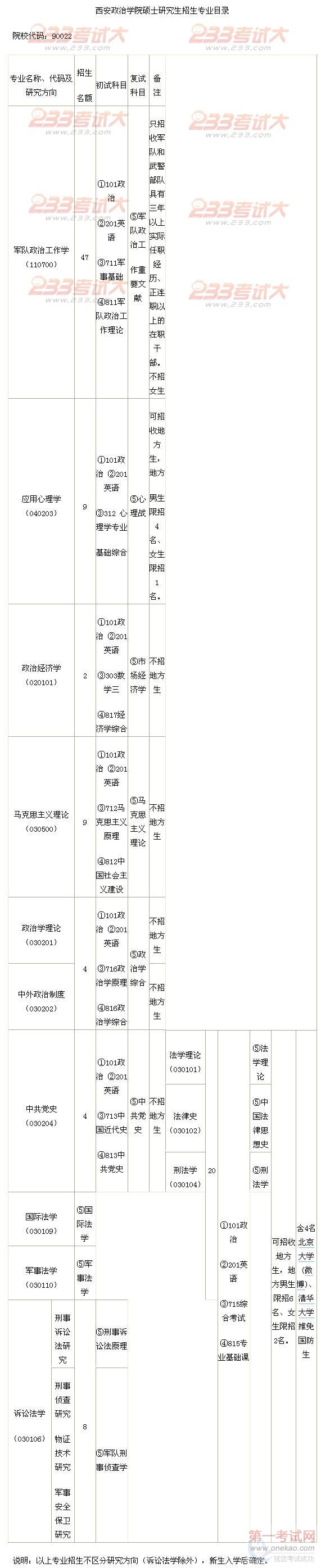 西安政治学院是直属于中国人民解放军总政治部的一所中级任职教育院校,担负着全军政治军官中级培训和研究生的培养任务。学院拥有军队政治工作学、军事法学、思想政治教育3个学科专业博士学位授权点,法学、政治学、马克思主义理论、军队政治工作学等4个一级学科硕士学位授权点,有政治经济学、应用心理学等硕士学位授权点,并具有军事硕士、法律硕士授予权(另备简章供索取)。其中军队政治工作学、军事法学专业是全军“2110工程”重点建设学科。