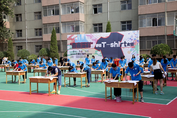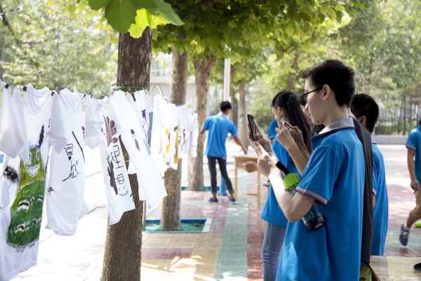 在这个炎炎夏日的上午,石家庄新华电脑学校操场上摆满了桌子,以间隔1.5米距离依次排开,每张桌子的左上方放有一件叠好的白色T恤、一张作品标签、两张报纸,旁边放置一个凳子和一个画板,比赛前夕学校贴心地为大家提供了白色T恤、涂料以及各种绘画工具。