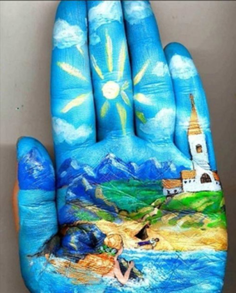 她说:“寻找一个与众不同的画布进行绘画创作并不是我追求的目标。我在画布和画纸上创作过很多作品。5年前我突发奇想,决定让自己的手掌充当画布。” #